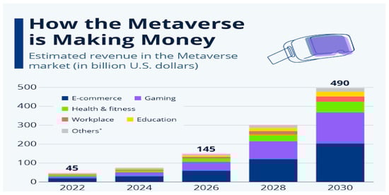Moreover, the world of gaming with the help of MR and VR can take players into the environment of the game and would no longer need a console and controller as the player’s environment could be morphed into that level and environment of the game they are playing. This tech could be achieved by MR (mixed reality), VR (virtual reality), or skeuomorphism for a multiplayer gaming mode. Figure 6 below shows that the estimated revenue in metaverse money-making, in US dollars, by the 2030s, will be USD 40 billion.
