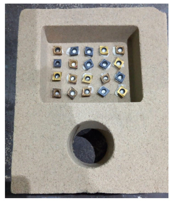 In this study, WC-Co tool tip scraps obtained from the manufacturing process in the industry, which are no longer used as reinforcement material, were utilized. Hadfield austenitic manganese steel was used as the metal matrix. The MMC was produced using the gravity metal casting method. WC-Co tool tip scraps were arranged linearly with equal spacing in a cavity mold as shown in Figure 1. The melting process of Hadfield austenitic manganese steel was carried out using a 250 kg capacity induction furnace (Inductotherm). The molten metal was poured into a sand mold with dimensions of 100 × 80 × 30 mm. After cooling, the mold was cut into several small samples for material characterization. The cut samples were heated at temperatures of 600, 700, and 800 °C for two hours, followed by air cooling to room temperature.