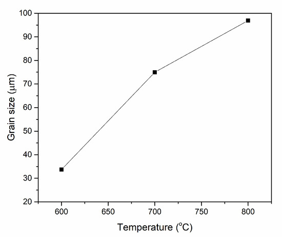 Grain size of austenite grain boundary at 600, 700, and 800 °C.