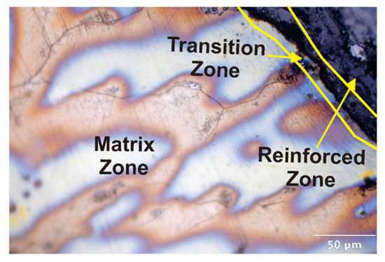 Zone variation in MMC heated at 700 °C (magnification 500×).