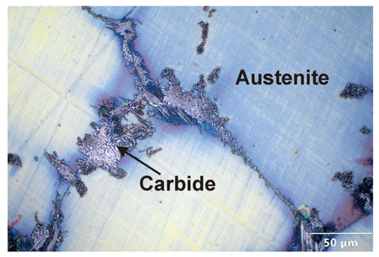 The microstructure testing results in Figure 5 also confirm the formation of carbides at the grain boundaries and within the austenite grains. The carbides exhibit a lamellar morphology and structure, displaying dark and bright regions. Nadi et al. confirmed that the formed carbides are of the (Fe,Cr)3C type. The carbide formation is attributed to segregation that occurs during the solidification process [19].