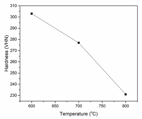 The results of the hardness testing on the Hadfield austenitic manganese steel matrix of the MMC at different temperatures are shown in Figure 6. The hardness testing was conducted at a distance above 2 mm from the interface zone to determine the influence of temperature on the mechanical properties of the Hadfield austenitic manganese steel matrix. The test results indicate that the MMC heated at temperatures of 600 °C, 700 °C, and 800 °C have hardness values of 303, 277, and 231 VHN, respectively, in the Hadfield austenitic manganese steel matrix region. The hardness of the Hadfield austenitic manganese steel matrix is influenced by the grain size of the austenite, where smaller grain size leads to a higher accumulation of carbides at the grain boundaries, thereby increasing the hardness of the Hadfield austenitic manganese steel matrix.