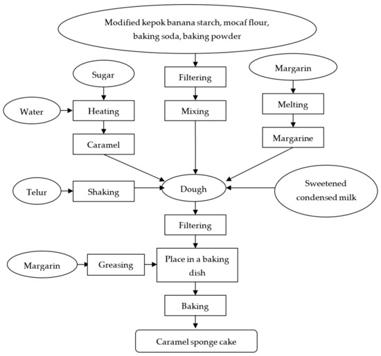 The procedure for processing the caramel cake is shown in Figure 1. The process involved adding sugar (200 g) to a frying pan until it melted. The sugar was cooked over low heat and hot water was added (200 mL) bit by bit and was stirred well. Margarin was melted over low heat, eggs (300 g) were added to the pan, and the mixture was stirred well using a mixer. Then, sweetened condensed milk (200 g) was added, as was, modified kepok banana starch and mocaf flour (0%, 20%, 40%, and 60%). Then baking powder (5 g) and baking soda (5 g) were added and dry (flour) and margarin were added alternately. The mixture was stirred until smooth. Liquid sugar was added to the mixture and the mixture was mixed. Then, the mixture was strained so that the lumpy ingredients were removed. The mixture was baked in a baking pan in the oven for 45–50 min at 180 °C. Once dry, the caramel cake was ready.