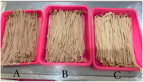 For the hedonic test, 35 slightly trained participants were asked to rate color, flavor, scent, texture, and overall acceptability on a 1–5 scale. Aroma was assessed by sniffing wet noodles, texture by biting, pushing, and tugging, and flavor by tasting. The panelists did not ingest the samples and rinsed their lips after each test [17].