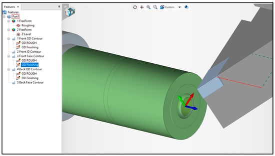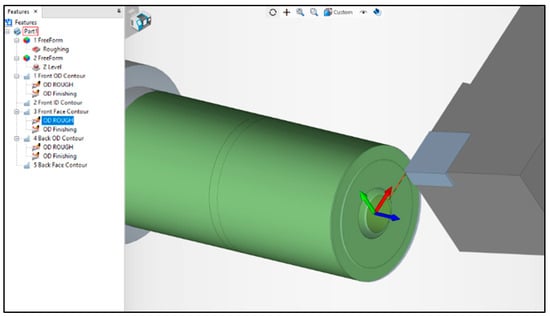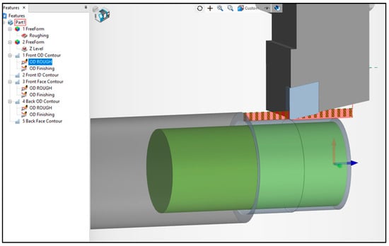 The P3G polygonal shaft is made through several machining processes according to the features contained in the shaft. The features in the simulation process for making polygonal profiles are the front outside diameter (OD) contour for roughing and finishing machining (see Figure 3 and Figure 4). This feature simulates adjusting the diameter of stock material to the diameter of the part/workpiece through the turning process.