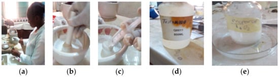 A measure of 6 g of powdered TiO2 was weighed and placed in a mortar for grinding, and 0.1 M of acetic acid was made as shown in Figure 5a–e. The following are the steps that were taken:
