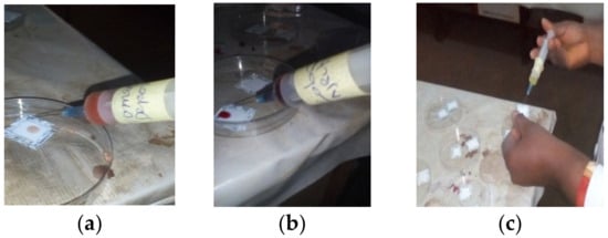 After a drop of the already prepared titanium oxide solution was deposited on the four slides and screen printed evenly, a drop of (a) laali, (b) tomato, and (c) zobo dye solution as shown in Figure 7a–c were added to it and annealed at 400 °C with a time lag of 3 min and left to cool.