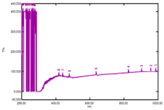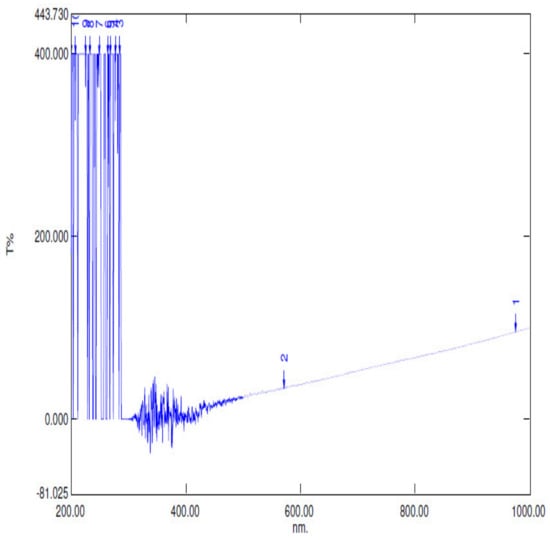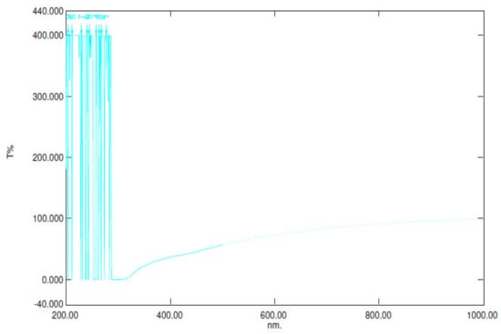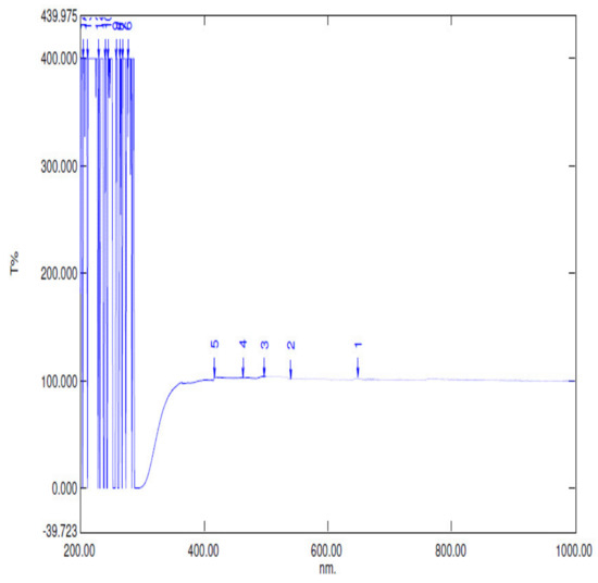 The XRD peaks of titanium dioxide TiO2 we found are similar to those of Sanjay et al. [22], with two prominent peaks, as shown in Figure 18 above, which show the anatase structure with a band gap of 3.2 eV and also the optical properties of titanium dioxide, which show 100% transmittance between wavelengths of 450 and 900 nm.