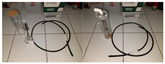 This study aimed to predict the performance of an SI engine by integrating a commercially available HHO generator into the engine. The HHO generator is readily available on multiple e-commerce platforms in Indonesia. The HHO generator product can be seen in Figure 1. The installation process for this tool is fairly simple. It involves placing the HHO generator outside the SI engine, which is frequently utilized in motorbikes, and then connecting the electric current source to the current input part of the HHO generator tool. Simultaneously, the HHO gases can be channeled towards the intake channel of the combustion chamber. The HHO generator tool utilizes a power supply with a maximum voltage of 30 V as its electrical input. The voltage can be adjusted to 15 V, 25 V, or 30 V. Additionally, tap water is utilized in the HHO gas production process due to its ready availability and cost-effectiveness by eliminating the requirement for additional electrolytes. The installation setup is shown in Figure 2.