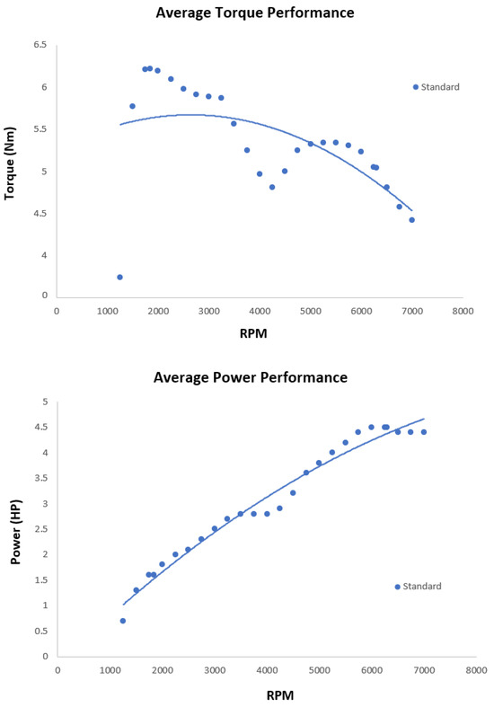 Given that no alterations were implemented under this setting, the operation of the engines adhered to the specifications set by the manufacturer. The data collected indicate that the engine exhibits a maximum torque of 6.22 Nm at an engine speed of 1840 RPM and a maximum power output of 4.5 HP at 6293 RPM. The engine’s fuel consumption rate is 0.987648456 kg per hour, while the brake specific fuel consumption (BSFC) value is 0.219477435 kg per hour per horsepower.