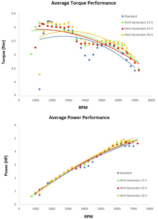 Due to energy loss at each stage because of transferring electrical energy to chemical energy and finally to mechanical energy, this value is hardly significant. The generation of HHO gas involves numerous stages that can dissipate energy [22]. Heat dissipation, electrolysis cell resistance, and electrolyte solution inefficiencies prevent some electrical energy from being converted into chemical energy when producing HHO gas [10,14]. For this study, tap water was used as a conductive medium for HHO gas generation, although it is not a specialized electrolyte. After producing HHO gas, the engine must burn it to provide mechanical energy. Partial combustion, heat dissipation to the engine and exhaust, and frictional losses due to engine mechanics make combustion inefficient. These inefficiencies partially convert input energy (electricity needed to generate HHO gas) into output energy (engine torque and power) [23,24,25]. This may explain the slight engine performance increases from the HHO generator.