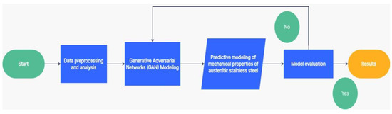 This study is an experimental research type with the aim of generating synthetic data regarding alloy chemical elements, heat treatment temperature, heating time, cooling media, and the mechanical properties of austenitic stainless steel in tabular form. The synthetic data is produced using the Generative Adversarial Networks (GAN) method. Subsequently, the synthetic data generated by GAN is utilized as a dataset for training machine learning models to predict the mechanical properties of austenitic stainless steel. The data augmentation and machine learning modeling processes are conducted using the Python programming language with the TensorFlow library, executed within the Google Colab environment. The dataset used in this study consists of tensile test results for various types of austenitic stainless steel (ASS), such as SUS 304, SUS 316, SUS 321, SUS 347, and NCF 800H. This dataset comprises 1916 data points, including the mechanical properties of austenitic stainless steel, alloy chemical elements, heat treatment temperatures, and cooling methods. The data was obtained from the British Steelmakers Creep Committee [9]. This data was collected by the Material Algorithm Project (MAP), which is a project conducted by the University of Cambridge. An illustration of the research stages can be found in Figure 1 to provide a clearer overview of how this entire study was carried out.