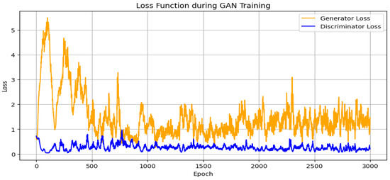 Based on Figure 3, it can be observed that the loss functions of the generator and discriminator change over time during training. At the beginning of training, the generator produces poor-quality data, as evident from the initially high generator loss on the graph. However, as training progresses, the generator learns to generate data that increasingly resembles the real data, resulting in a reduction in the generator’s loss function. On the other hand, the discriminator’s loss function is initially high as well but decreases as training continues because the discriminator must contend with an increasingly proficient generator. The ultimate goal of GAN training is to achieve a balance where the generator produces data that closely resembles real data and the discriminator struggles to differentiate between the two. This is indicated by both the generator and discriminator loss functions stabilizing at relatively low levels, which occurs at Epoch 3000, with a discriminator loss of 0.176 and a generator loss of 1.83.