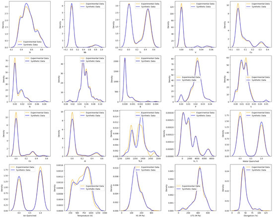 Based on Table 1, it can be observed that the KS statistic for all variables, including chemical elements, heat treatment, and the mechanical properties of austenitic stainless steel, falls within a relatively low range approaching 0, except for the heating time, which has a value of 0.28. These values indicate that the distribution of chemical elements, heat treatment, and the mechanical properties of austenitic stainless steel in synthetic data tends to be similar to the distribution in real data.