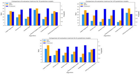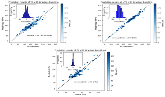 From the testing results of the three mechanical properties of austenitic stainless steel, the Random Forest and Gradient Boosting algorithms outperform the other four algorithms. Random Forest and Gradient Boosting exhibit lower MAE and RMSE values as well as higher R-squared values. This is evident in the MAE value of 11.21, RMSE of 15.09, and R-squared of 0.85 for YS. For UTS, the model achieves an MAE of 12.68, an RMSE of 18.59, and an R-squared of 0.95, while EL obtains an MAE of 3.71, an RMSE of 6.32, and an R-squared of 0.81. These results indicate low error rates and a strong fit between predictions and actual values for the three mechanical properties of austenitic stainless steel.