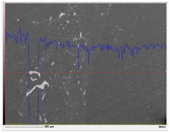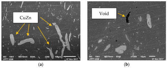 At 1000 X magnification (see Figure 7b), weld defects in the form of voids were visible in some places. Specifically, at the scanning position, a void was found with a length of up to 20 μm and a width of 4 μm. Several small spherical (dot-like) voids with a diameter of less than 1 μm were also found. Most of these voids were found within the aluminum matrix rather than at the edges of the brass filler granules. The defect was formed due to the imperfect reformation of the aluminum base metal during the FSW process and was not caused by the filler material. The presence of defects and large crystal grains can reduce the mechanical properties of the weld.
