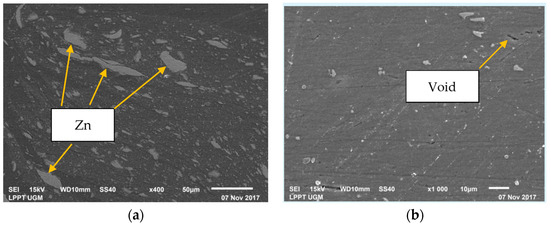 At a magnification level of 1000 X (see Figure 8b), there were visible weld defects in the form of voids in some places. Unlike Specimen 1 (brass filler), the void found was minimal in size and round in shape (like a dot). The size of the void diameter was less than 1 μm and was only detected in one or two places. All voids were in the aluminum matrix. The void was not due to the addition of filler. Voids occurred due to the FSW process on aluminum material caused by trapped air or dirt particles.