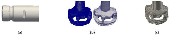 In the first step of processing, it was crucial to create a watertight triangular mesh and its alignment to the required coordinate system. Creating the watertight triangular mesh consisted of removing any holes that were formed during the scanning process. The scanned data were positioned generally in space, and for further manipulation, it was necessary to align everything into a unified coordinate system. Regarding the fact that the entire rotor system was scanned as a whole, a clamping area was identified at the end of the rotor shaft that is outside the refining ladle area, as shown in Figure 2a. The connection of the rotary impeller and the rotor shaft was made by means of a bolted joint. For this type of connection, it is not possible to determine the same zero position for all rotary impellers. As a first processing step, the number of elements of the triangular mesh was reduced. A reduction of 40–50% had virtually no effect on the original shape of the mesh and significantly simplified the subsequent processing in the next step. The first processing step was the only processing step, which required an adjustment of the triangular mesh by the user.