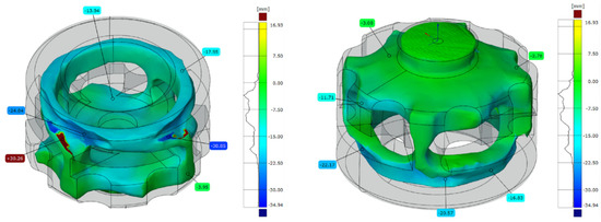 In case there is data for identical rotor systems with zero or more operational cycles, it is possible to use the particular 3D CAD models for obtaining data regarding the rotor material loss depending on the number of duty cycles, as shown in Table 2. The rotors were scanned at predefined intervals that corresponded to different stages of the lifespan (from 0 to 100%). The rotor material loss was evaluated in PolyWorks® 2021 IR9 software. The results do not consider all parameters, which were set on the FDU unit within the refining process; they take into account only the total number of cycles and the amount of loss on a given type of rotor system. For low (LP) and high pressure (HP) regimes, the rotor shaft has to be included in the total loss comparison.