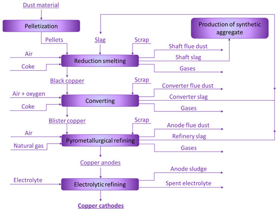 Due to the high demand for copper in information technologies and electromobility, the production of this metal is increasing. Nowadays, therefore, copper is considered to be the “new gold”. Copper is produced from primary and secondary raw materials, mainly using pyrometallurgical methods. Secondary copper production during shaft furnace–converter–anode furnace methods generates solid wastes such as slags and flue dusts—from the shaft furnaces, converters, and anode furnaces. Flue dusts can be defined as fine-grained products obtained from the melt in the form of dust which is sucked by fans through filter stations and subsequently captured in electrostatic precipitators or fabric filters [1,2,3].