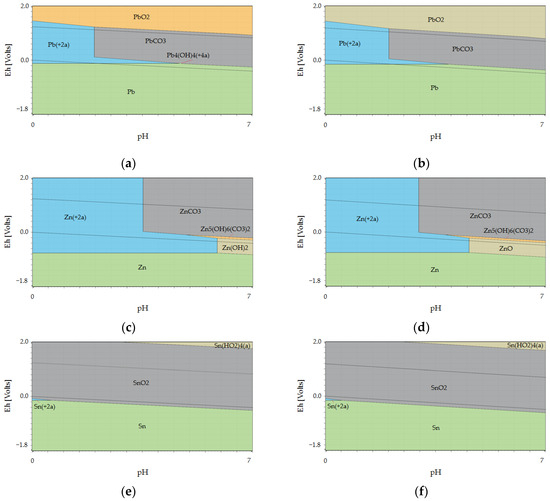 Pourbaix diagrams of PbO, ZnO, and SnO2 leaching in CH3COOH at temperatures of 20 °C and 80 °C: (a) the Pb−C−H2O system at a temperature of 20 °C; (b) the Pb−C−H2O system at a temperature of 80 °C; (c) the Zn−C−H2O system at a temperature of 20 °C; (d) the Zn−C−H2O system at a temperature of 80 °C; (e) the Sn−C−H2O system at a temperature of 20 °C; (f) the Sn−C−H2O system at a temperature of 80 °C.