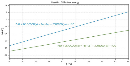 Figure 2 shows the Pourbaix diagrams of PbO, ZnO, and SnO2 leaching in the CH3COOH solution at temperatures of 20 °C and 80 °C, respectively. Equations (1) and (2) represent the leaching reactions of PbO and ZnO in the acetic acid solution. The dependence of the standard Gibbs free energy (ΔG°) values, according to Equations (1) and (2), on temperature is expressed graphically in Figure 3.