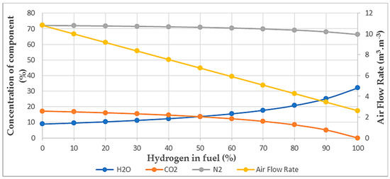 Effect of different hydrogen concentrations in the fuel on the composition of the flue gas.