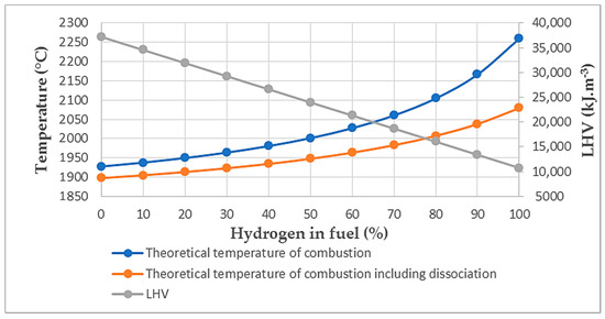 The low heating value (LHV) of hydrogen (10,748 kJ·m−3) is approximately 3.5 times lower than the low heating value of natural gas (37,213 kJ·m−3) [9]. This fact implies that increasing the concentration of hydrogen in a mixture with natural gas reduces the overall heating value of that mixture. The LHV represents a measure of the energy content of a fuel, indicating that increasing the content of low-heating-value hydrogen in the mixture reduces the energy content of the mixture. This can influence the energy efficiency and performance of the combustion process.