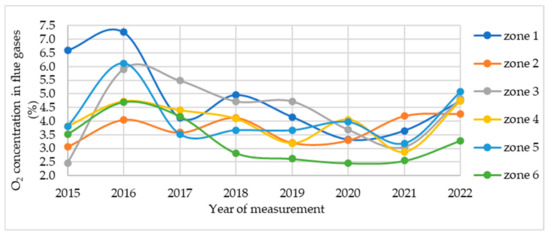 One of the areas of the measured data processing was the adjustment of combustion ratios. Measurements of flue gas composition and O2 concentration in the flue gas were carried out between 2015 and 2022. This O2 concentration in the flue gas was uneven and the combustion process on the individual burners was carried out with different excess combustion air. In the case of high excess combustion air, some of the unused combustion air or O2 took heat away from the outgoing flue gases, which consequently had a lower temperature. Therefore, less heat was transferred to the steel strip and, as a result, to heat the steel strip to the required temperature, fuel consumption had to be increased. The average values of the oxygen concentration in the flue gas for the individual zones of the heating chamber are shown in the graph (Figure 1).