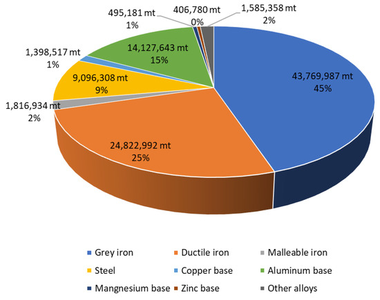 According to the Modern Casting magazine (data from 2021), approximately 102 million metric tons of castings are produced globally each year (Figure 1), with most castings being made from gray iron (43.8 million metric tons) and ductile iron (24.8 million metric tons). The countries belonging to the European Foundry Association (CAEF) produce approximately 16.8 million tons of castings annually, representing 16.5% of global production. The World Foundry Organization (WFO) states that for every one ton of castings produced, there is one ton of waste, which, according to the authors [1], has the following composition: