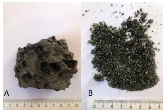 Cupola furnace slag: (A)—slowly cooled; (B)—granulated.