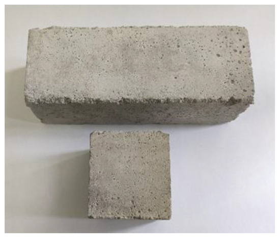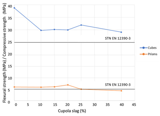 Due to its characteristics, cupola slag has the potential for use in the construction industry in concrete production. The substitution of fine aggregate with ground cupola slag was also carried out at the Institute of Metallurgy, Faculty of Materials, Metallurgy, and Recycling at the Technical University of Košice. From concrete mixtures, in which ordinary quartz sand is commonly replaced with ground cupola slag in quantities of 0, 10, 15, 20, 25, and 40 wt. %, samples in the shape of cubes and prisms were prepared (Figure 3). All the mixtures contained approximately 16% cement (Type I 42.5 R) and 1.2 mL of plasticizing admixture (MC Power-Flow 2695). The amount of water for each mixture was adjusted to achieve the desired workability and consistency determined by the slump test method. The prepared samples were cured in molds for 24 h, and then submerged in water for 7 days. After the removal from water, they were left to air-cure for 22 days. After 30 days from casting, the samples underwent compressive strength and flexural strength testing.