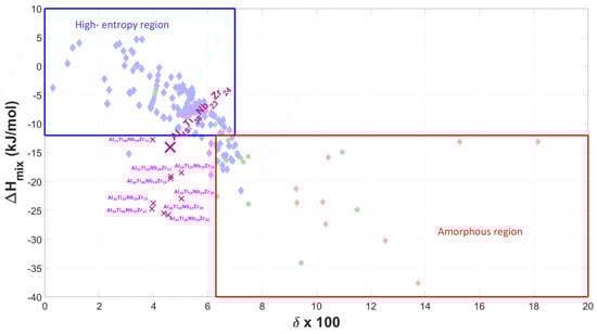 | Alloy | ΔHmix [kJ/mol] | δ× 100 | ΔSmix | VEC |