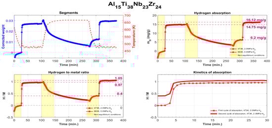 | Alloy | Absorption H [wt.%/H/M] | Residual H [wt.%/H/M] | Desorption H [wt.%/H/M] | Cycle Efficiency [%] |