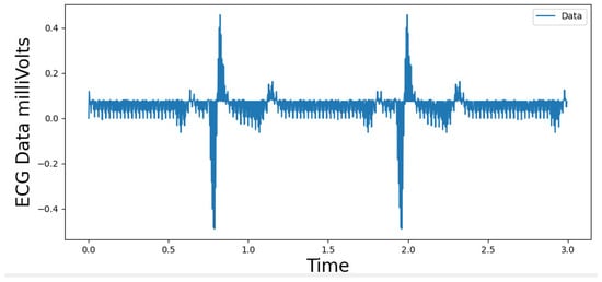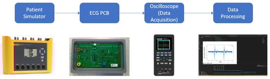 A patient simulator is used as a biopotential source, with lead placement limited to the Einthoven three-lead placement system. The output of the ECG PCB is captured on a PC using an oscilloscope and PC-based software. The data are captured as a csv file. These data are pre-processed by the learners in MS Excel and graphically depicted to review the morphology. The data are then subject to a Pan–Tomkins [8] QRS detection algorithm using Python. The ECG PCB produces an ECG trace, shown in Figure 2, that has typical ECG morphology characteristics, and QRS detection is possible with correlation between the patient simulators heart rate and the heart rate identified by the QRS detector. Various circuit functionalities are tested by the learners such as removal of the low-pass filter, notch filter, and high-pass filter, as well as altering RV1 to introduce a DC offset.