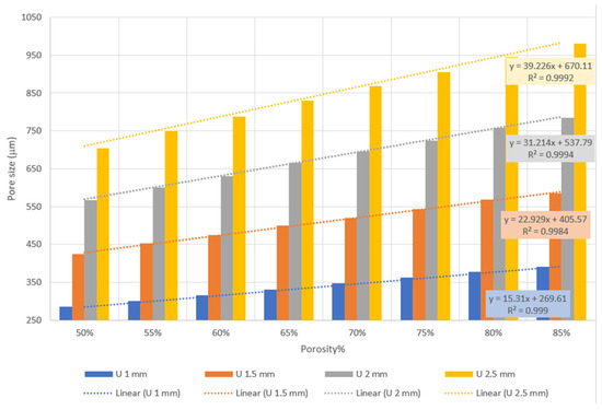 The results provided in Figure 1 reveal that pore sizes between 285 and 980 µm can be covered by altering unit cell size and porosity from 1 mm and 50% to 2.5 mm and 85%, respectively. Additionally, the results show a strong linear correlation between porosity and pore size with an R2 value near 1.