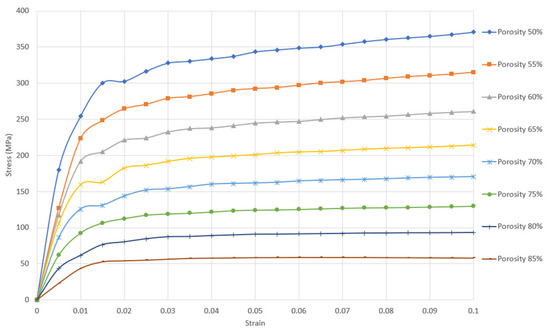 Stress–strain curve in the elastic-plastic region of gyroid sheet network with unit cell size 1 mm and porosity between 50 and 85%.