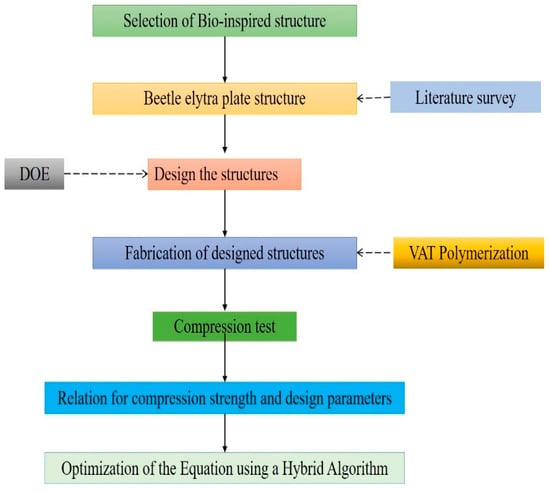 After finalizing the range of the design parameters, the module design of experiments (DOEs) in MINITAB 19 software was used to create the set of specimens. Once the set of design parameters was known, Fusion 360 2.0.15775 CAD software calculated specimens and converted the CAD file into an STL file. The slicing, fabrication, and testing processes of all specimens were carried out as mentioned in the research study [10]. The total procedure carried during the current research is visualized in Figure 2.