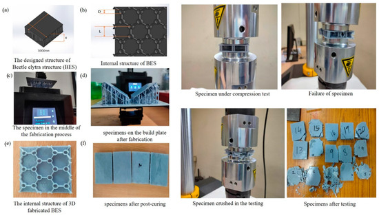 Growth in the advancement of 3D printing technology has made it easy to fabricate complicated bio-inspired structures (BISs). In this paper, the sandwich structure of the beetle elytron structure (BES) hollow cylinder, influencing every corner of the honeycomb structure, is designed by considering parameters like the thickness, length, and diameter of the hollow cylinder, with the different ranges taken giving minimum and maximum values in the response surface methodology (RSM). Sandwich structures are fabricated using VAT polymerization technology. A Universal Testing Machine (UTM) tests the fabricated structures for compression, and results are recorded from the tests of each specimen. All specimens’ compressive strength (CS) and energy absorptions (EA) values are calculated. Design parameters at which the energy absorbed and the compression strength are high are evaluated and considered optimal parameters for a specific range of values.