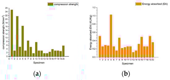 After testing all specimens, the compression strength values were recorded for each specimen, and the variations in all specimens are shown in Figure 3a. The area calculated for the energy absorption values of each specimen under the stress–strain curves was recorded through Blue Hill V 4.42 software connected to UTM. The formula used to calculate the EA values is given by Equation (1)