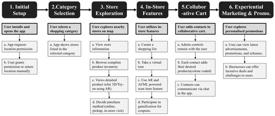 A systematic app development process was applied, which included user journey mapping, task flows, micro-interactions, card sorting, navigation diagrams, defining user interface (UI) elements, and style guides. After these steps, low-fidelity and high-fidelity interactive prototypes were made in the Figma tool. A typical use case scenario of the users’ interaction is shown in Figure 2.
