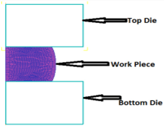 The axisymmetric work piece between top die and bottom die after compression in DEFORM 2D.