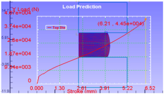 The experimental investigation focused on aspect ratios (AR) of 1.0, while AR values of 0.75 and 0.5 were analyzed using DEFORM-2D V 8.1. Figure 1 shows the model. Figure 2 depicts the load vs. the displacement from the simulation. Chandrasekhar et al. [11] studied sintered billets’ compaction and deformation characteristics. Disc compression tests determined k and n. Preforms were sintered at 500 °C for an hour with an initial density of 0.88. A preform with a 1:1 aspect ratio was designed for the program’s geometry with a starting density set at 0.88. Compression occurred between hard-surfaced platens, with ram a speed of 0.5 mm/sec and friction between the work piece and dies of 0.3. The displacement, density, and deformation load were recorded, along with the top and bottom bulged dimensions.