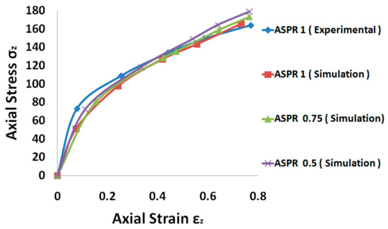 Figure 3 illustrates the axial stress versus axial strain relationship in the simulation and experiments. Stress rises with strain, especially as the preform aspect ratio decreases from 1 to 0.5. The reduced aspect ratio increases the load concentration, closing smaller pores faster, accelerating stress increase compared to higher aspect ratio samples.