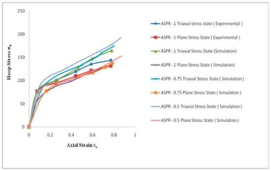 Figure 4 depicts stress states and their relation hoop stress σθ versus axial strain εZ. In both stress conditions, hoop stress σθ increases with axial strain, more so in triaxial stress. Simulations and experiments exhibit similar patterns, with slight variations. A reduced aspect ratio augments hoop stress.