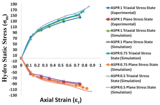 Figure 5 depicts the axial strain εz and σm relationship, increasing concurrently in triaxial and plane stress conditions across stress states. Hydro static stress σm is compressed in plane and tensile in triaxial conditions. The simulation agrees with the experiments, consistent across aspect ratios.