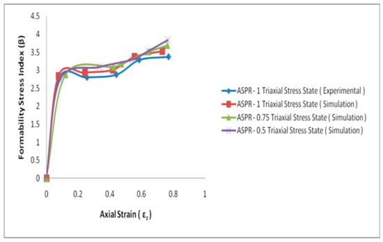 Figure 6 compares the formability stress index (β) and axial strain (εZ) under triaxial stress, aligning experimental and simulation data. β increases rapidly with εZ, consistently across aspect ratios. Formability stress is comparable up to 0.15 axial strains, and lower ARs signify lower β.