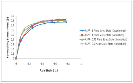Figure 8 depicts the relationship between β and axial strain under plane stress. Formability stress initially increases with strain before leveling off, which is consistent across the simulation and the experiment. The aspect ratio minimally affects the formability strain index.