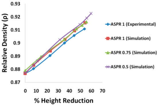 Figure 9 shows the density increasing with higher height reduction percentages. The simulation aligns closely with the experiments, with aspect ratios having minimal effect. Compression tests reveal pore closure, enhancing the density. Higher aspect ratios exhibit slower densification due to increased pore content.