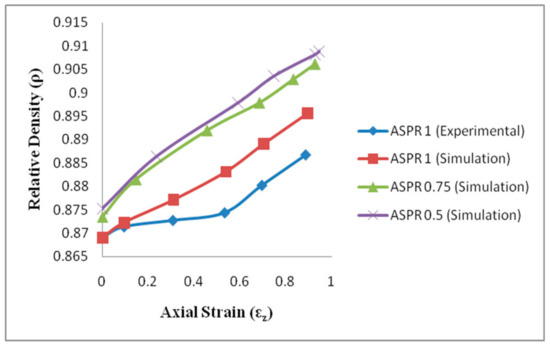 Figure 10 illustrates the relationship between axial strain and relative density for aspect ratios 1, 0.75, and 0.5. The density increases with strain for all ratios. Smaller ratios show a higher density. Compression closes pores, enhancing densification.